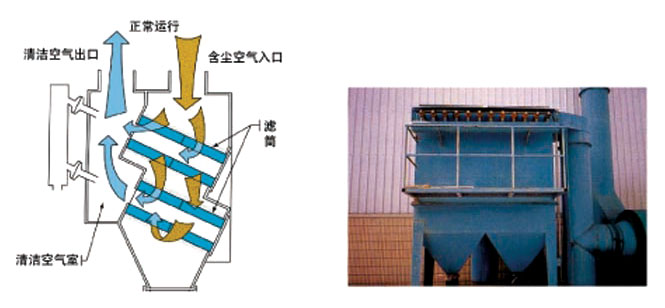當濾筒表明捕集的粉塵達到一定數(shù)量時,濾筒的過濾阻力也隨之達到某一定值時,控制閥將自動打開,壓力空氣直接沖入濾筒中心,把捕集在濾筒表面的粉塵吹凈,粉塵在重力的作用下,隨著氣流下沉集塵斗中。。